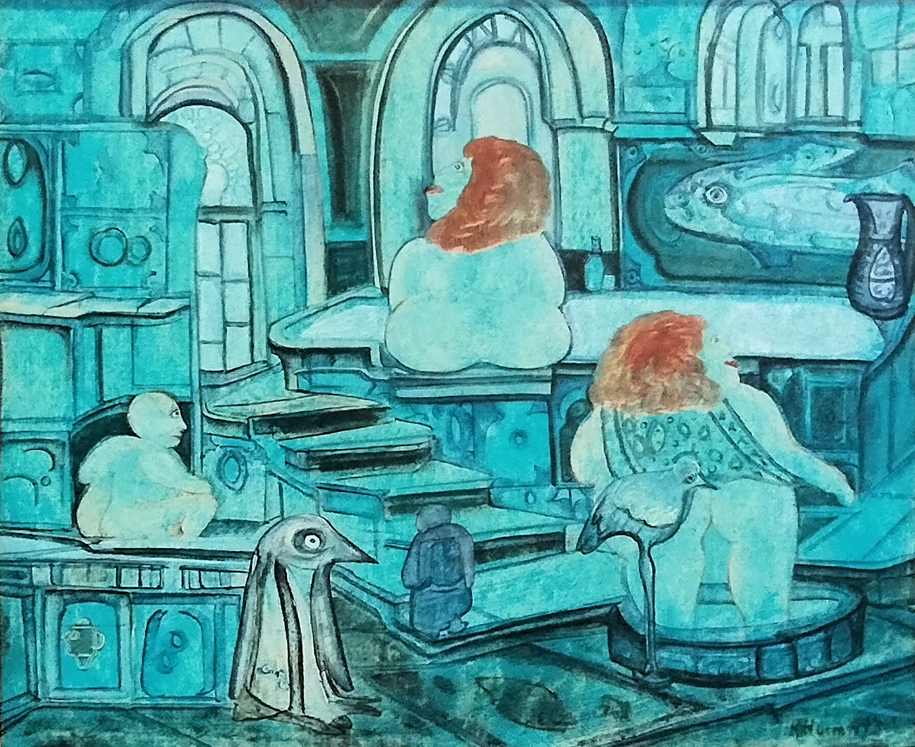 Het kleine kunstwerk ‘Bad met pinguïn’ is ondergedompeld in de kleur blauw. Het lijkt op het interieur van een badhuis met kathedraalramen en heeft verschillende etages. Centraal in het schilderij loopt een trap van rechtsonder naar linksboven. Onderaan de trap zit een kleine man in monnikengewaad, devoot geknield. Links van hem een grote pinguïn met een lange jas en een groot helder oog, zijn snavel wijst naar de geknielde persoon. Op een verhoging daarachter zit en kleine kale man in zijn nakie. Hij loert naar twee badende, forse, roodharige dames aan de andere kant van de trap. Ze zijn met de rug naar de kijker toegekeerd. De dame vooraan staat met haar ontblote billen in een bassin. Achter haar staat een steltvogel met zijn puntige snavel gevaarlijk dicht bij haar. Beide kijken naar rechts. Op het plateau daarboven zit de andere vrouw met haar billen op de badrand, zij kijkt naar linksboven. In de opening van het venster boven haar is een kruis te zien, daaronder een tableau van een vis en een kruik. Een raadselachtig, mythisch verhaal met veel symboliek. Bevat de voorstelling een waarschuwing zoals bij de oude meesters in de schilderkunst? Geloof en seksualiteit? De deugden en de geneugten? De man links van de trap kijkt naar de wellustige dames. De trap kan het zinnebeeld zijn voor de brug van het geweten. Staat de steltvogel met gesloten oog symbool voor lust en de pinguïn voor inzicht en wijsheid vanwege zijn grote heldere oog?