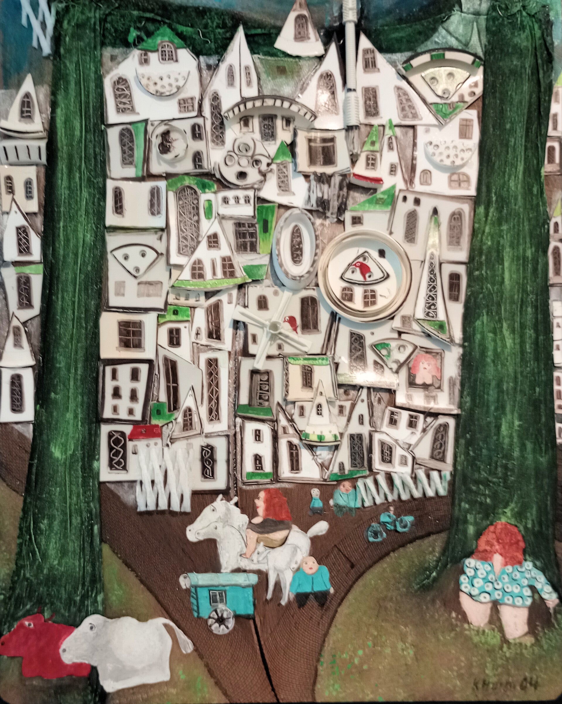 Het werk ‘Twee bomen buiten de stad’ stelt de stad voor als een blokkendoos van op elkaar gestapelde huizen. De kleur wit is dominant. Aan weerszijden van het schilderij staan twee groene boomstammen die als flinke komkommers uit de grond oprijzen. Ze werken als een omlijsting net zoals in het schilderij op het affiche van de tentoonstelling waar ook twee bomen aan de zijkant staan. Dat geeft diepte en omsluit de ruimte. Op de voorgrond een straat met figuren, dieren en een kar. Verbazend hoe de ragfijne lijnen van de bestrating precies dezelfde kant op lopen. Met de loep zie ik dat het een panty is, waarvan de middennaad van de pantybroek precies door het midden van de straat loopt. Waarom al dat gepriegel terwijl het ook zo kan moet de kunstenaar gedacht hebben. Met deze wetenschap zie ik opeens meer kleine voorwerpen op het schilderij zoals verpakkingsmateriaal dat dienstdoet als een hekje. Later schilderde hij er weer omheen zodat het een geheel vormt.