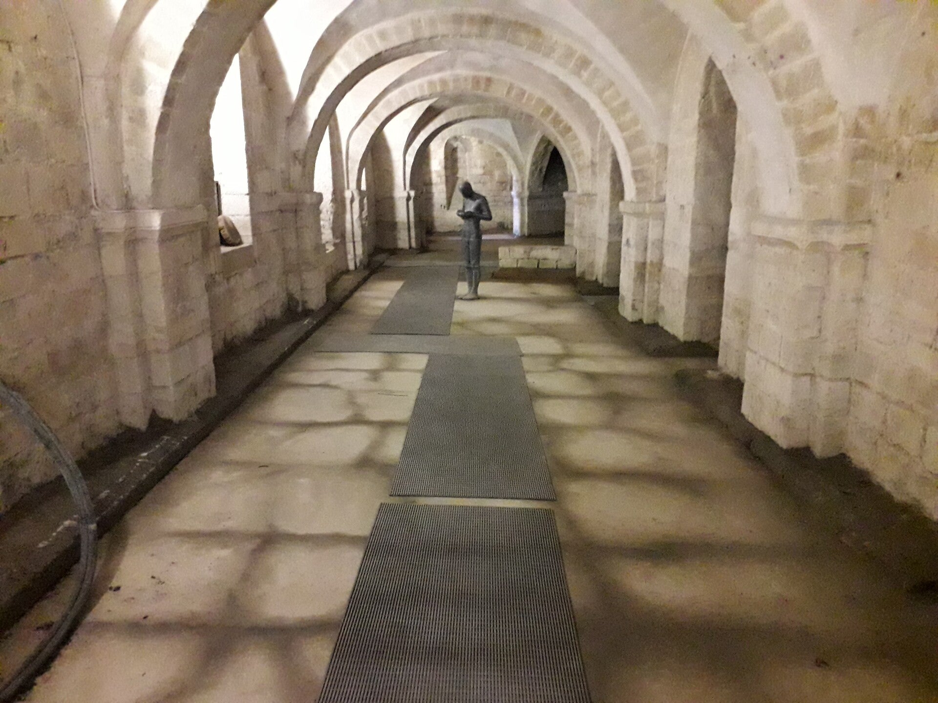Dwalend door het enorm imposante gebouw zie ik een gids met een groep toeristen. Ze gaan de crypte in en ik loop er nieuwsgierig achteraan. In de catacombe staat een beeld dat mijn aandacht trekt. De gids vertelt erover waarna de groep doorloopt. Ik blijf even bij het beeld staan. Het is een staande figuur met voorovergebogen hoofd, zijn handen omsluiten een kom die hij voor zijn borst houdt. Als ik weer opkijk zijn de toeristen uit het zicht verdwenen en het hek achter mij waardoor wij binnengekomen zijn is gesloten. Wat nu? Gelukkig heb ik mijn mobiel op zak.